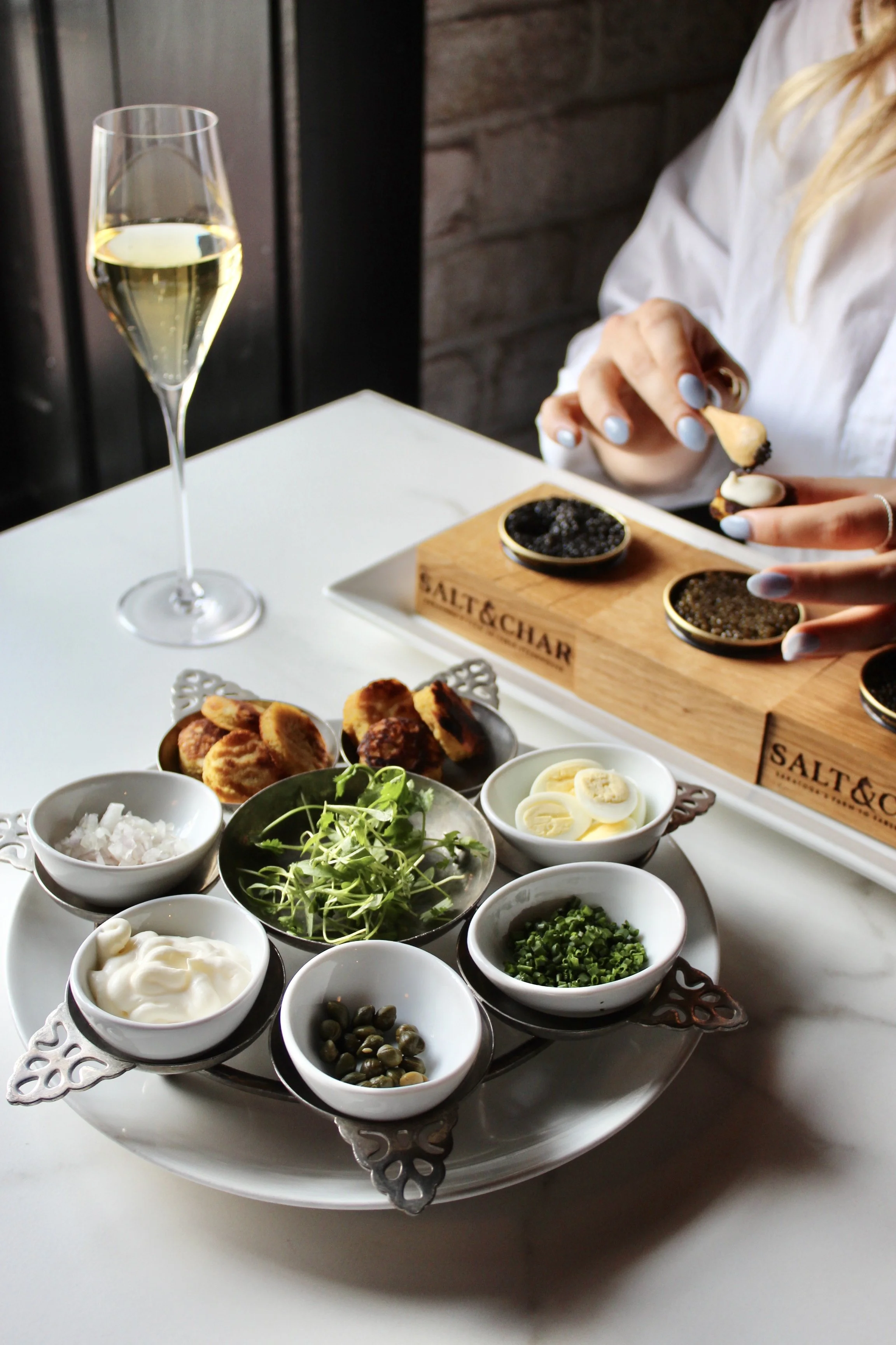 A woman in a black dress arranging white orchids in a beige vase on a white pedestal.