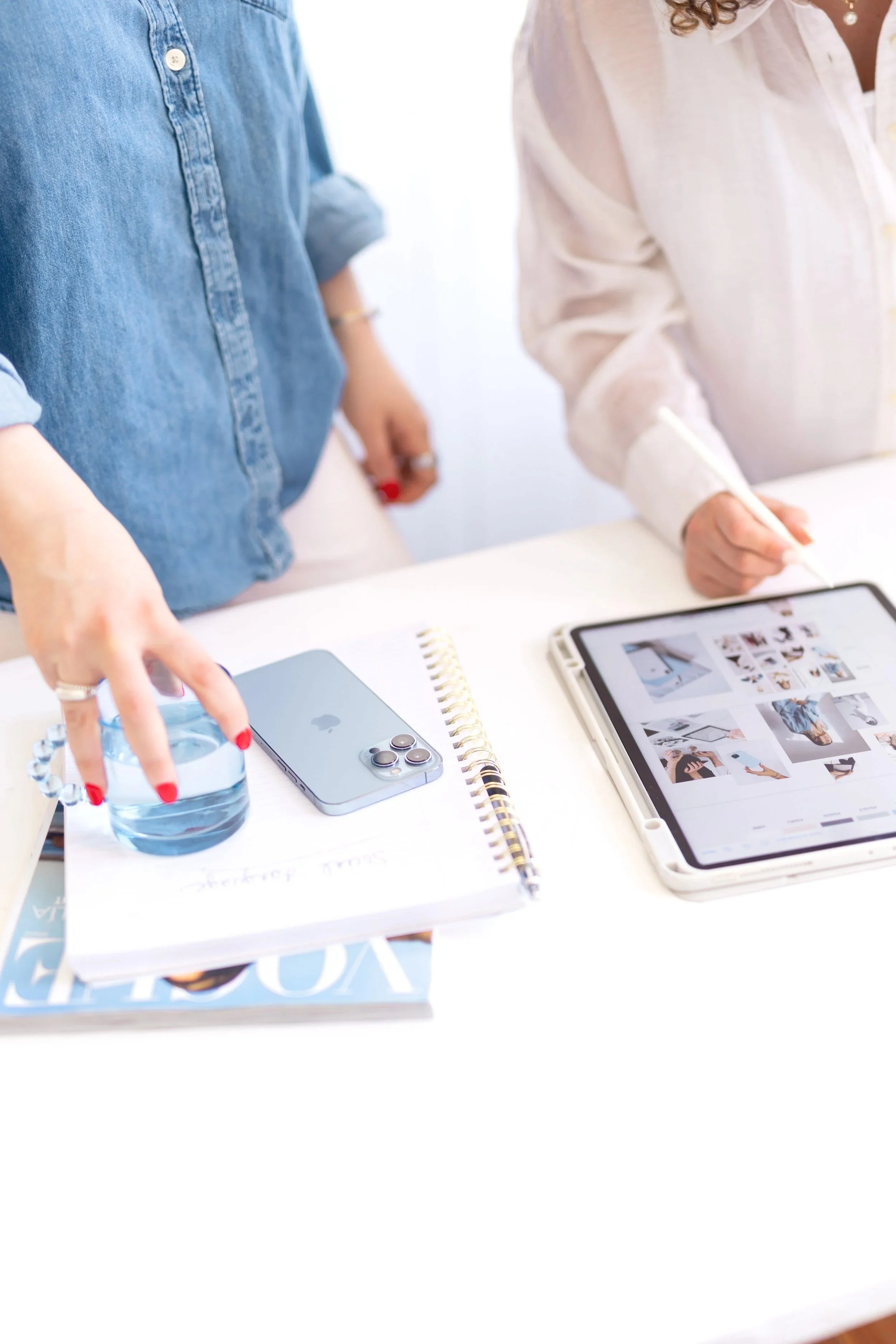 People arranging flowers on a white table with vases, scissors, ribbons, and various flowers in a bright room.